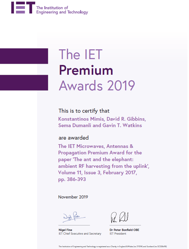 Dr Dumanli's paper "The ant and the elephant: ambient RF harvesting from the uplink" has been selected for The IET Premium Awards by The IET Microwaves, Antennas & Propagation. The IET Premium Award is an award that is given every two years to the most original and ground-breaking research published in The IET Microwaves, Antennas & Propagation. The motivation given is as follows: